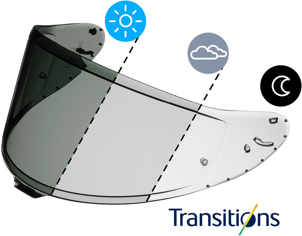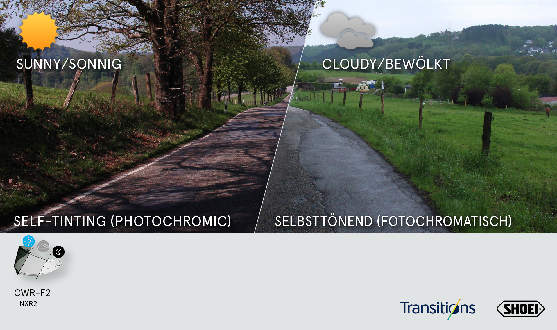Lichtdurchlass: dynamisch 23-80% /// UV-Filter: >99% /// PINLOCK-Vorbereitung: Ja /// Konformität ECE-R 22.06: Nein /// Einsatzmöglichkeit: Tag (sonnig bis wechselhaft)