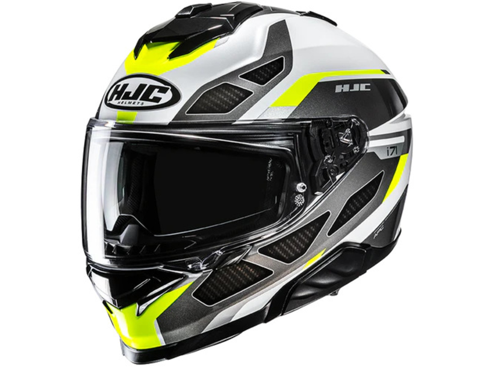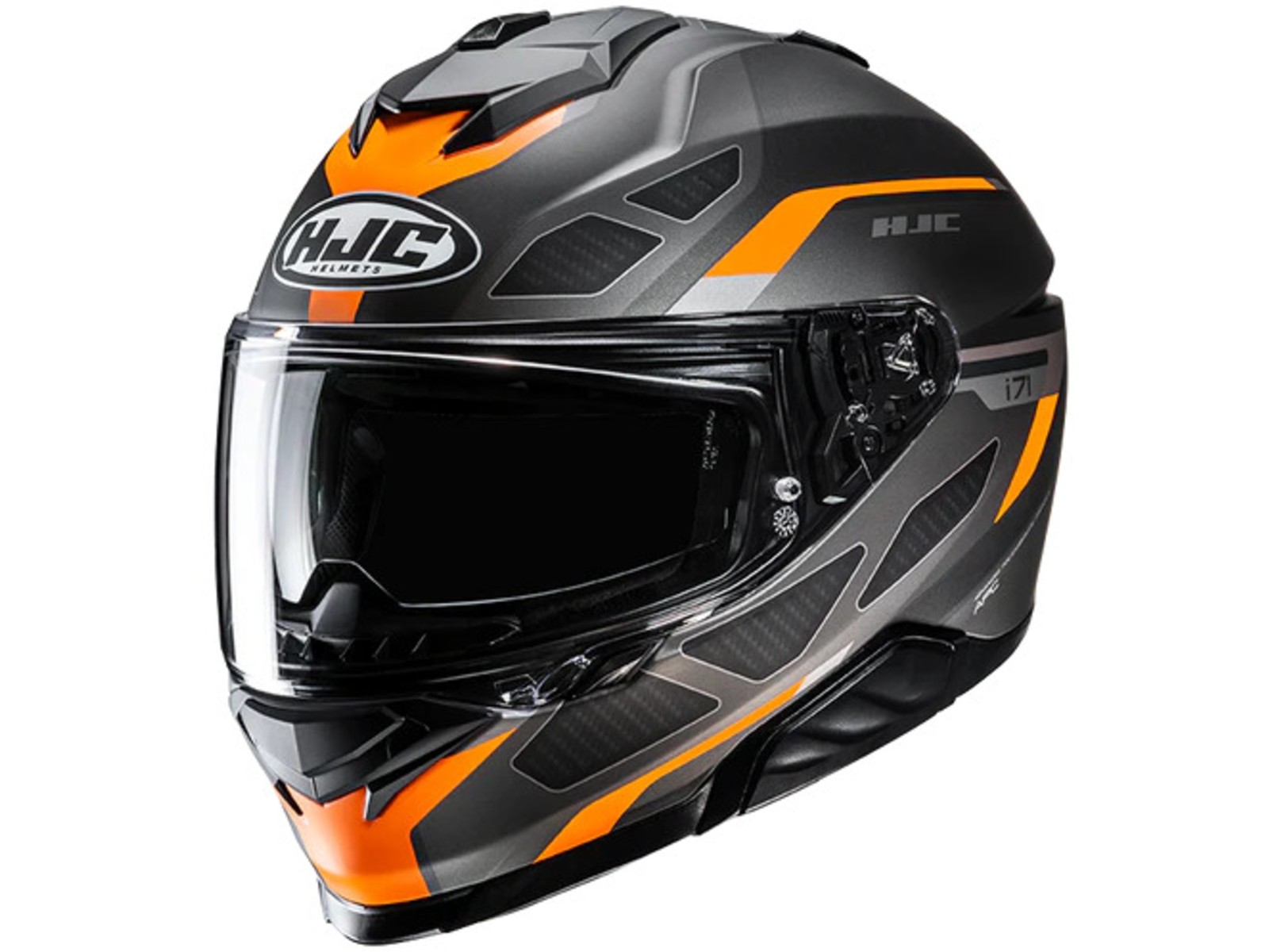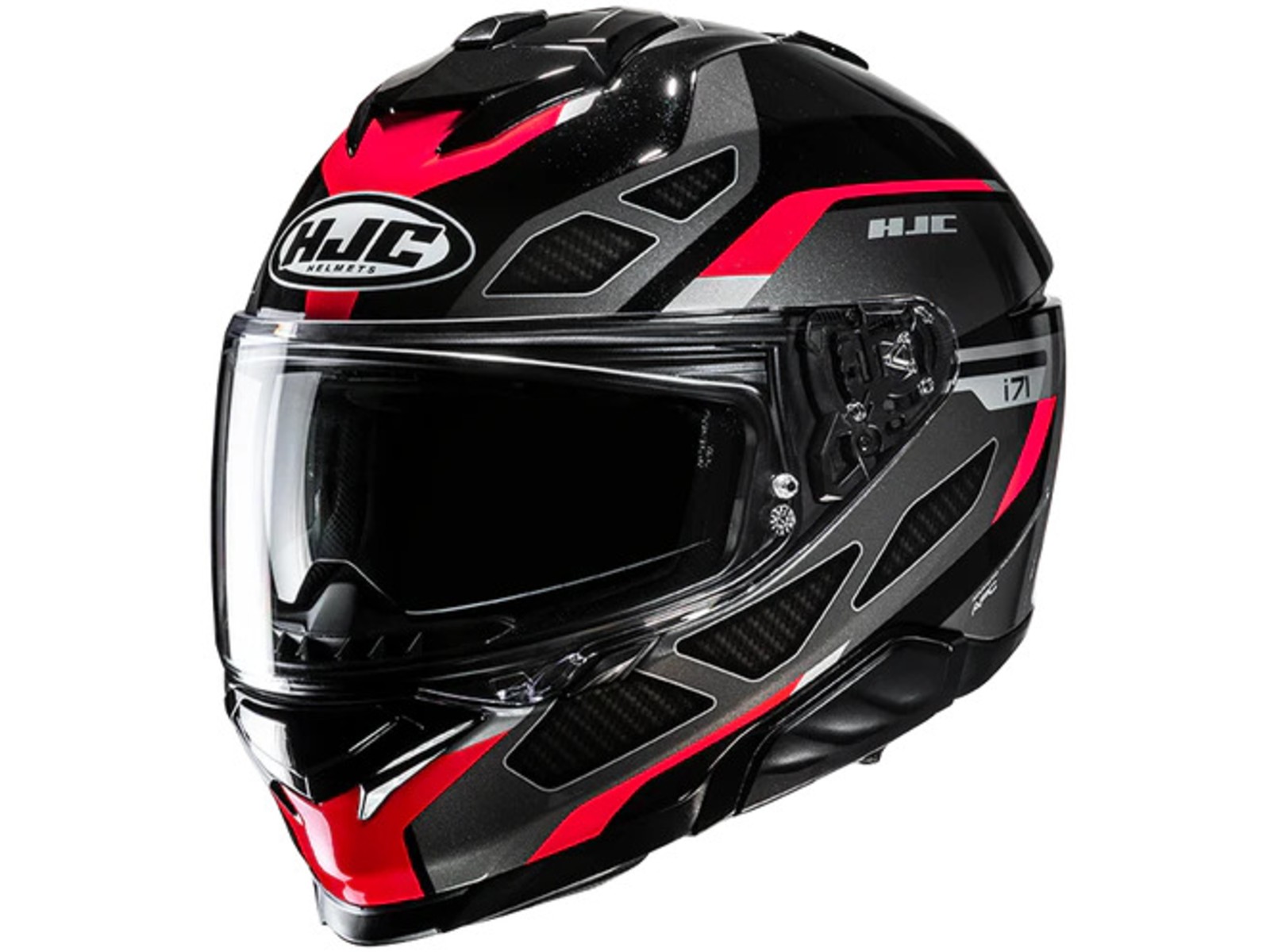 Der i71 setzt mit seinem neuen, schlanken Schalendesign neue Maßstäbe für ein Sport-Touring-Modell. Der Helm aus fortschrittlichem Polycarbonat bietet eine hervorragende Balance aus geringem Gewicht, hoher Stoßfestigkeit und optimalem Tragekomfort. Die neu angeordnete obere Belüftungsöffnung und die vergrößerte Kinnbelüftungsöffnung ermöglichen eine verbesserte Luftzufuhr und Belüftung. Ebenfalls neu beim i71 sind das Visier und die Sonnenblende. Das HJ-38 Pinlock-Visier ist mit einem neuen Druck-Schiebe-Verschlusssystem ausgestattet, das für mehr Sicherheit sorgt, dennoch auch mit Handschuhen leicht zu bedienen ist. Die neue Sonnenblende (HJ-V12) bietet dem Fahrer die Möglichkeit, die Sonnenblende in 3 Positionen nach vorne zu verstellen (bis zu 10 mm), um einen idealen Sonnenblendschutz zu gewährleisten. Der i71 ist auch mit den SMART HJC Bluetooth-Systemen der zweiten Generation kompatibel.