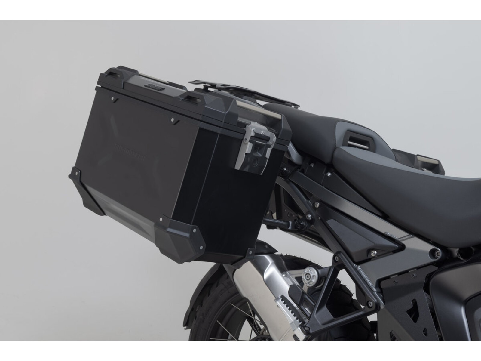 Das Adventure Set TRAX ADV enthält die zur BMW R 1300 GS Adventure passenden PRO-Seitenträger und das passende ADVENTURE-RACK. Die Seitenträger und der Gepäckträger werden an den modellspezifischen Anbaupunkten befestigt und bieten sicheren Halt für die schwarzen TRAX ADV Alukoffer.